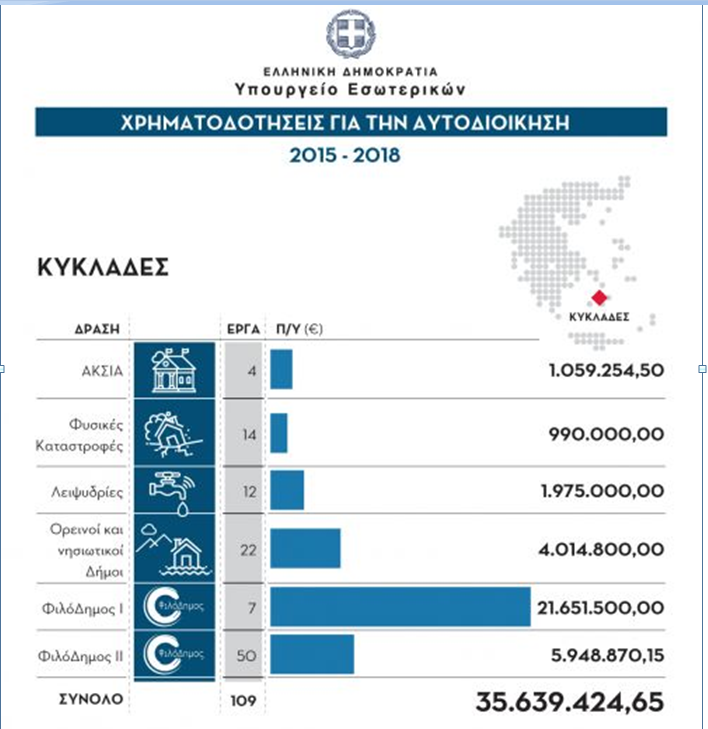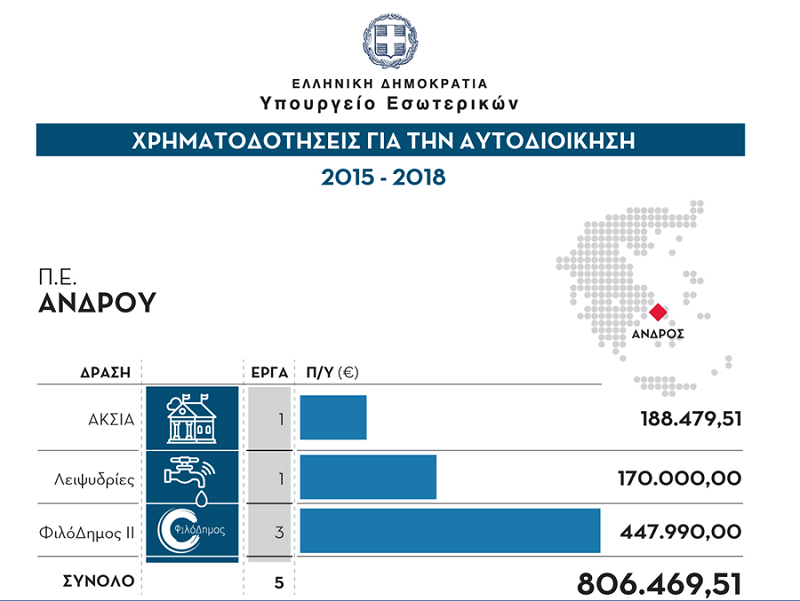 Στα 35.639.424 ευρώ οι χρηματοδοτήσεις του ΥΠΕΣ για την Αυτοδιοίκηση τα έτη 2015-2018 στις Κυκλάδες από αυτά η Άνδρος πήρε 806.470 ευρώ. Τα χρήματα δόθηκαν με δύο προγράμματα του υπουργείου: το Φιλόδημος Ι & ΙΙ.
