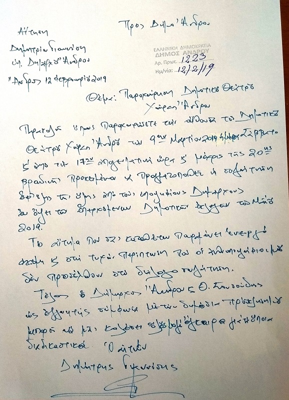 Είμαι λοιπόν σε θέση να σας ανακοινώσω ότι σήμερα κατέθεσα προσωπικά αίτηση προς το Δήμο Άνδρου, με αριθμό πρωτοκόλλου 1223 και με θέμα την παραχώρηση του δημοτικού θεάτρου στις 9 Μαρτίου 2019, ημέρα Σάββατο, από τις 5 το απόγευμα έως τις 8 το βράδυ για τη διεξαγωγή συζήτησης ενόψει των εκλογών του Μαίου!