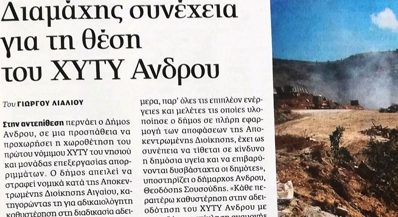 (α) Κατασκευή ΧΥΤΥ στην Άνδρο. Υπάρχει πλέον εγκεκριμένη μελέτη και επίκειται και η χρηματοδότηση.