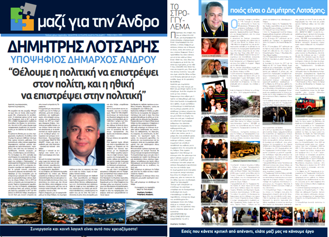 ΔΥΟ ΛΟΓΙΑ ΓΙΑ ΤΟΥΣ ΣΥΝΤΕΛΕΣΤΕΣ ΤΟΥ 4σέλιδου. Ο Βελισσάριος Χρυσάγης φίλος της Άνδρου, με Ανδριώτικη ομάδα στο Φέισμπουκ και επί χρόνια στενός συνεργάτης του πρώην δημάρχου Γιάννη Γλυνού. Ο Άρις βρέθηκε εθελοντικά στο πλευρό του Δημήτρη Λοτσάρη από την αρχή και ανέλαβε αφιλοκερδώς τον έντυπο σχεδιασμό της καμπάνιας του. Οργανωτικός, με ανώτερες σπουδές και επί χρόνια επαγγελματίας στον χώρο των εντύπων, είναι αυτός που τρέχει το 4σέλιδο και σχεδιαστικά και ως επιμελητής των κειμένων. Όπως μας πληροφόρησε σε λίγες μέρες θα εκδοθεί και το δεύτερο τετρασέλιδο όπου θα έχει ως έκπληξη δημοσίευση για τα νερά της Άνδρου γνωστού τεχνοκράτη του νησιού, ο οποίος συνεργάζεται ως επιστήμονας με τον Δ. Λοτσάρη. που όπως μας εξήγησαν έχει συγκροτήσει επιστημονική ομάδα για τα θέματα του νησιού. Περιμένουμε... ΕΝ ΑΝΔΡΩ.