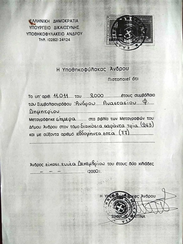 Η μεταγραφή του ακινήτου στο συμβολαιογραφείο Άνδρου (αρχείο Δ. Γιαννίση)