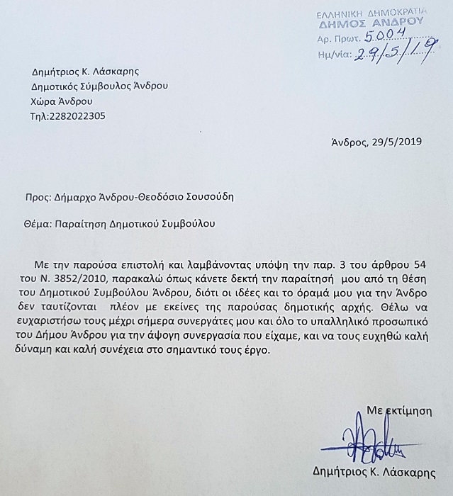 Με αίσθημα ευθύνης, κατέθεσα σήμερα την παραίτηση μου από τη θέση του Δημοτικού συμβούλου, και ζήτησα τη διαγραφή μου από τον συνδυασμό «Νέοι Ορίζοντες» διότι οι ιδέες και το όραμα μου για την Άνδρο δεν ταυτίζονται με την παρούσα δημοτική αρχή.