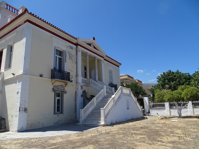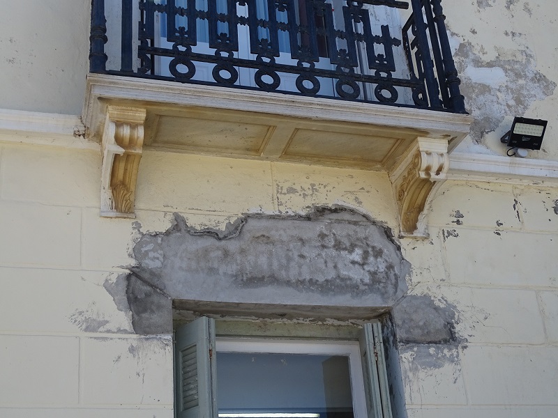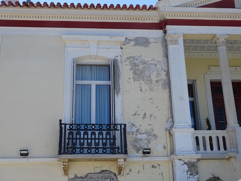 Η καταρρέουσα πρόσοψη του δημαρχείου Άνδρου. Σε αυτή την σκάλα έγινε η ορκωμοσία Σουσούδη και του τότε Δημοτικού Συμβουλίου το 2014. Το κτίριο που συντηρήθηκε το 2012 - επί Γλυνού - το 2014 ήταν ακόμα σε καλή κατάσταση. Έτσι έγινε η ορκωμοσία. Έκτοτε και επί 5ετία δεν μπήκε πινελιά. Ιδού πως είναι σήμερα...