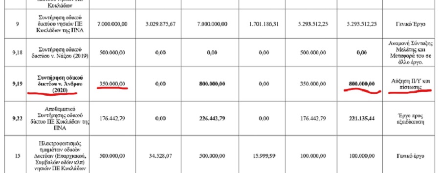 Κατόπιν εισηγήσεων του Επάρχου Άνδρου Δημήτρη Λάσκαρη και της προϊσταμένης της τεχνικής υπηρεσίας του Επαρχείου, λόγω των μεγάλων αναγκών συντήρησης του Επαρχιακού οδικού δικτύου, στην συνεδρίαση του Περιφερειακού Συμβουλίου στη Ρόδο στις 22 Σεπτεμβρίου 2019 συζητήθηκε στο 5ο θέμα ημερησίας διάταξης η αύξηση του ποσού στο τεχνικό Πρόγραμμα Κυκλάδων με τίτλο «Συντήρηση οδικού Δικτύου ν.Άνδρου», από 350.000€ όπου ήταν εγγεγραμμένο στον προϋπολογισμό, σε 800.000€. Η απόφαση πάρθηκε κατά πλειοψηφία , καθώς η παράταξη του Μανώλη Γλυνού ψήφισε παρόν.