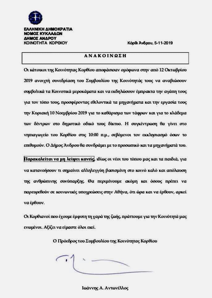 Πιο πρόσφατο παράδειγμα κινητοποίησης το Κόρθι, που την Κυριακή 10 Νοεμβρίου το Τοπικό με επικεφαλής τον πρόεδρο του Γιάννη Αντωνέλλο καλεί τον κόσμο σε μια μεγάλη εθελοντική εξόρμηση να καθαρίσουν την περιοχή τους (δρόμους, ρέματα, χαντάκια) με την βοήθεια των μηχανημάτων του Δήμου Άνδρου και των χειριστών τους που θα είναι παρόντες. Δείχνοντας έμπρακτα την αγάπη για την περιοχή τους όλοι. Αξίζει κάθε συμπαράστασης η προσπάθεια τους κι ελπίζουμε να βρει ανταπόκριση.
