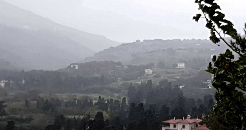 Στη διάρκεια της μέρας η βροχή που έριξε μάλλον έσβησε την φωτιά προς το βράδυ και δεν μύριζε στη Χώρα. Αναγνώστες από το Κόρθι και την Χώρα έστειλαν φωτογραφίες από την σφοδρή βροχόπτωση. Κι ένας από Πιτροφό και φωτογραφία της καιόμενης χωματερής στη διάρκεια της μέρας.