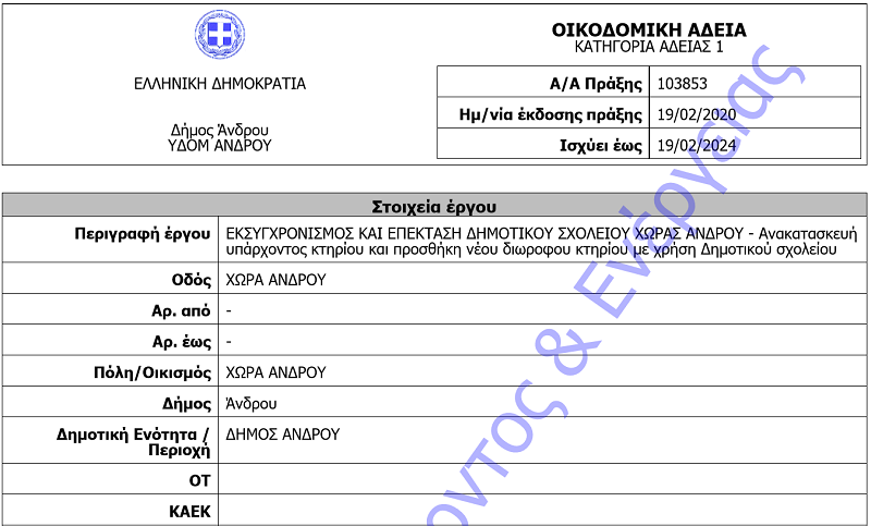 Η οικοδομική άδεια του Δημοτικού Σχολείου της Χώρας. Είναι η τελευταία πράξη μιας μελέτης που θεωρείται πλέον ώριμη για ένταξη για χρηματοδότηση και για την κατασκευή του έργου. Είναι το "τελικό οκ" όπως λένε οι μηχανικοί...