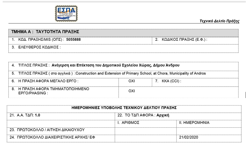 Και το τεχνικό δελτίο της κατάθεσης στο ΕΣΠΑ για να προχωρήσει η κατασκευή του έργου.