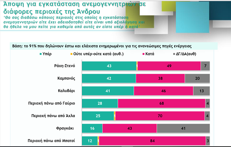 Συνεπώς, η Άνδρος - ανάλογα με την περιοχή - νοιώθει διαφορετικά απέναντι στις ανεμογεννήτριες. Οι ανεμογεννήτριες της ΔΕΗ ανανεώσιμες του μακρινού Καμπανου είναι αποδεκτές σε ποσοστό 42%! Συνάμα έχουν και ένα +4% θετικό ισοζύγιο, καθώς αρνητική γνώμη έχει το 38%. ΈΣτο Καλυβάρι υπάρχει θετική άποψη 41%. Αν εδώ το συνολικό ισοζύγιο στο -5%. Τέλος στην Ράχη Κορθίου (στα όρια του Στενού) τα πράγματα δείχνουν μεν αρνητικά, αλλά εκπλήττει το ελάχιστο -6% του ισοζυγίου, καθώς ένα 43% λέει ναι και ένα 49% λέει όχι!