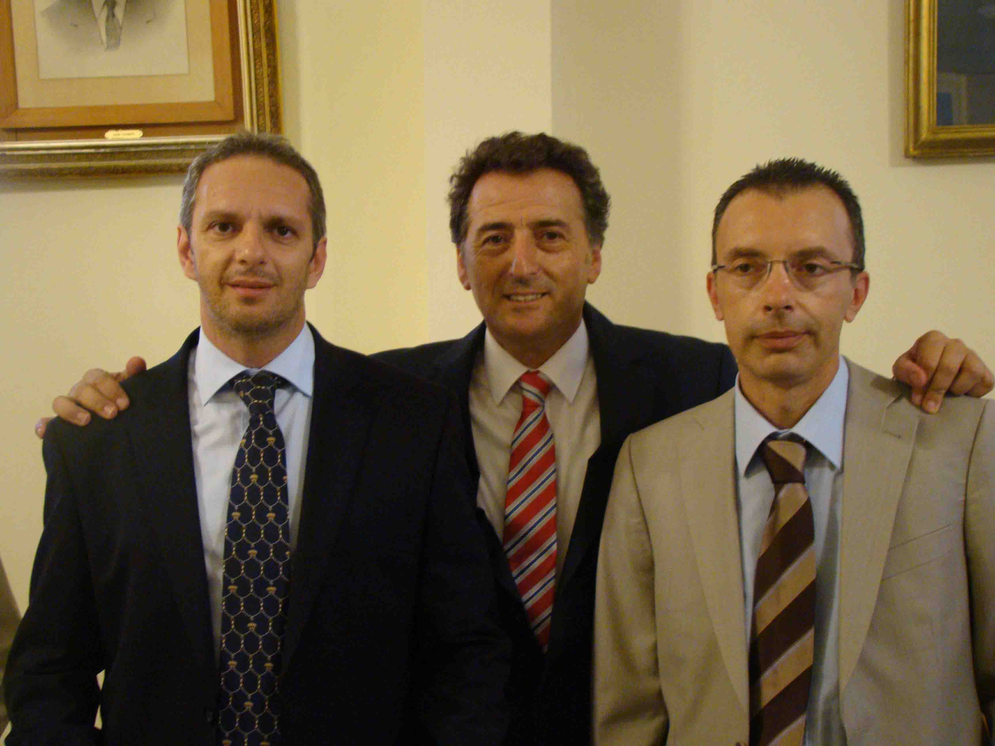 Ο δήμαρχος Θεοδόσης Σουσούδης μετά την ορκωμοσία με δύο στενους και διαχρονικούς συνεργατές του: τον Χρήστο Βουραζέρη και τον Κυριάκο Θωμά, .