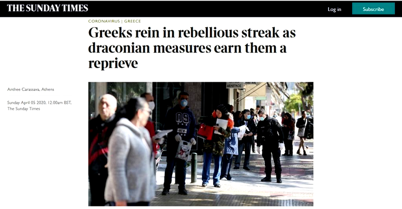 (Mε τη χώρα μας ασχολούνται οι Βρετανικοί Times, οι οποίοι τονίζουν ότι παρά το γεγονός ότι δεν είμαστε και ο πιο νομοταγής λαός, τώρα βγάζουμε μια σπάνια και νηφάλια εικόνα κόντρα στην απείθαρχη φύση μας…)