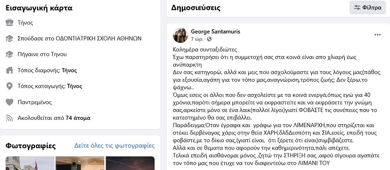 Το προφίλ Σανταμούρη στο Facebook όπου και ο σχολιασμός πως "ΔΙΑΦΕΝΤΕΥΕΙ ΤΟ ΛΙΜΑΝΙ ΤΟΥ"!!! Εντύπωση κάνει πως τον πρόεδρο λάτρη του facebook ακολουθούν μόνο 74 άτομα!!!