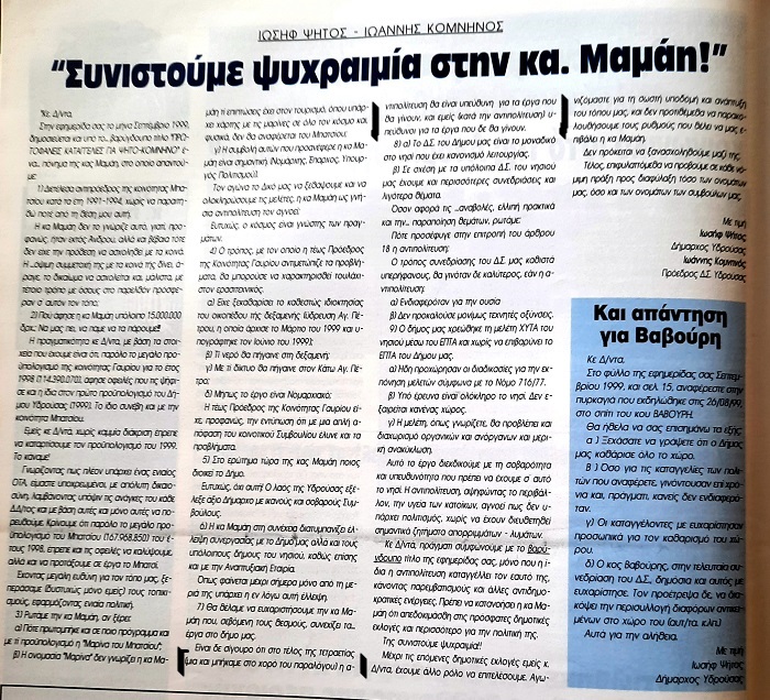 Το πρώτο το βρήκαμε στις σελίδες του περιοδικού Άνεμος που έβγαινε στην Άνδρο παλαιότερα. Εκεί οι τότε επικεφαλής του Δήμου Υδρούσας κατήγγειλαν την κ. Τασούλα Μαμάη με χιούμορ και δηκτικότητα για το πρόγραμμα «υιοθεσίας» έργων που εκτελούσαν αυτοί! Έγραφαν τότε οι δύο επικεφαλής του Δήμου Υδρούσας προς την τότε αντιπολιτευόμενη και πρώην διοικούσα Τ. Μαμάη στο περιοδικό Άνεμος: