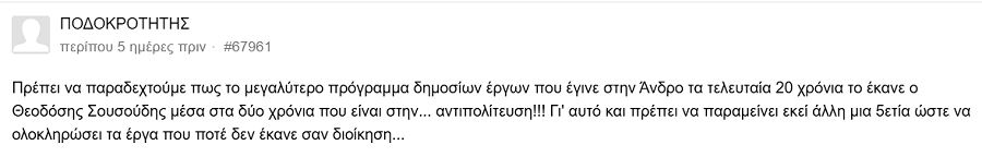 «Πρέπει να παραδεχτούμε πως το μεγαλύτερο πρόγραμμα δημοσίων έργων που έγινε στην Άνδρο τα τελευταία 20 χρόνια το έκανε ο Θεοδόσης Σουσούδης μέσα στα δύο χρόνια που είναι στην... αντιπολίτευση!!! Γι' αυτό και πρέπει να παραμείνει εκεί άλλη μια 5ετία ώστε να ολοκληρώσει τα έργα που ποτέ δεν έκανε σαν διοίκηση...»
