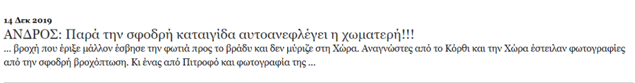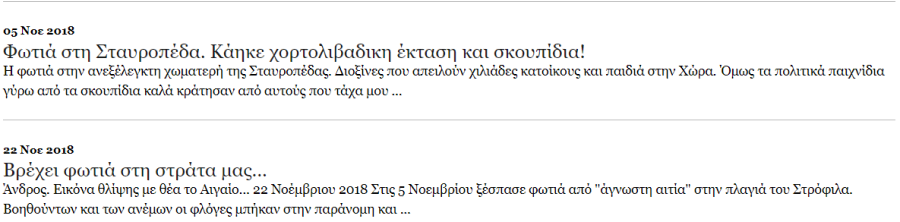 "Γύρω στις 11 το πρωί σήμερα 14/12 την ώρα της πιο πυκνής βροχής με τους νοτιάδες να φυσούν ισχυροί ανεφλέγη η χωματερή της Άνδρου στην Σταυροπέδα. Ειδοποιήθηκε η πυροσβεστική από τον δήμαρχο και οι δασοπυροσβέστες από τον αντιδήμαρχο Δ. Γιαννίση, ενώ ο υπεύθυνος αντιδήμαρχος Δημήτρης Τηνιακός έσπευσε μέσα στην σφοδρή καταιγίδα που ήταν σε εξέλιξη να δει τι συνέβαινε. Σύμφωνα με τις πληροφορίες μια μεγάλη μπάλα σκουπιδιών που δεν είχαν προλάβει να την καλύψουν με χώματα είχε αυτοαναφλεγεί παρά το γεγονός πως το νερό που έπεφτε ήταν πολύ. Έχουμε γράψει αρκετές φορές για την αυτοανάφλεξη των σκουπιδιών. Ιδίως όταν φυσούν ισχυροί νοτιάδες. Ατυχώς αυτό συνέβη και σήμερα παρά την σφοδρή βροχόπτωση..."