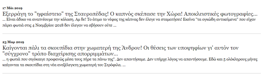 Και επειδή ο Καμήλος δεν το είχε πάρει είδηση τόσα χρόνια γιατί κάπου αλλού κοίταγε και το Pitsouni δεν είχε ακόμα ανακαλύψει την Άνδρο, παραθέτουμε από το αρχείο του ΕΝ ΑΝΔΡΩ μια πρόχειρη λίστα αναφλέξεων στον ΧΑΔΑ της Σταυροπέδας από το 2015 μέχρι το 2019. Αναφέρουμε 5 δημοσιεύματα φωτιάς στον ΧΑΔΑ Νοέμβριο, Δεκέμβριο, Μάρτιο και Μάϊο! Μήνες με αυξημένη υγρασία που όμως βοήθησε όπως γράφαμε και τότε στην αυτοανάφλεξη.