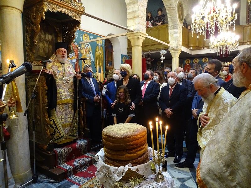 Από την λειτουργία. Ο μητροπολίτης επί του άμβωνος και οι επίσημοι στην πρώτη γραμμή. Στην εκκλησία υπήρχε προσοχή και οι εκκλησιαζόμενοι ήταν σχετικά λίγοι και προσεκτικοί τηρώντας μέτρα για την πανδημία.