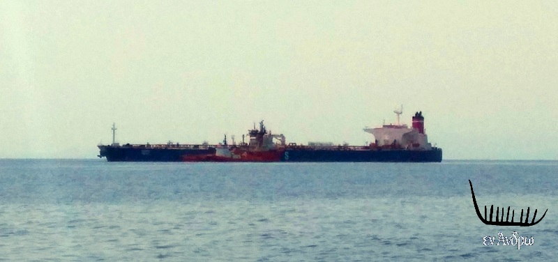 Το ρωσικό τάνκερ Pegas αγκυροβολημένο στ' ανοιχτά της Καρύστου με δύο ρυμουλκά δίπλα του. Φωτογραφία Εν Άνδρω.gr