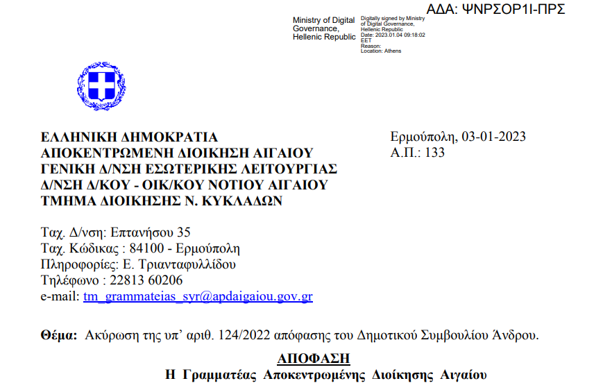 Φωτογραφία της προμετωπίδας της ακυρωτικής απόφασης της Αποκεντρωμένης Διοίκησης Αιγαίου
