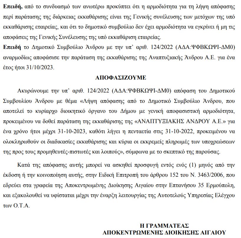 Ακυρώθηκαν οι αποφάσεις του συμβουλίου που συγκάλεσε μόνη της στις 29 Οκτωβρίου 2022 (με την πλειοψηφία που διαθέτει λόγω απλής αναλογικής η συνασπισμένη αντιπολίτευση) για την Αναπτυξιακή Εταιρεία του Δήμου Άνδρου. Θυμίζουμε πως τότε είχαν ψηφίσει αλλά αντί άλλων και οι 13 σύμβουλοι που διαθέτει και ήταν παρόντες.