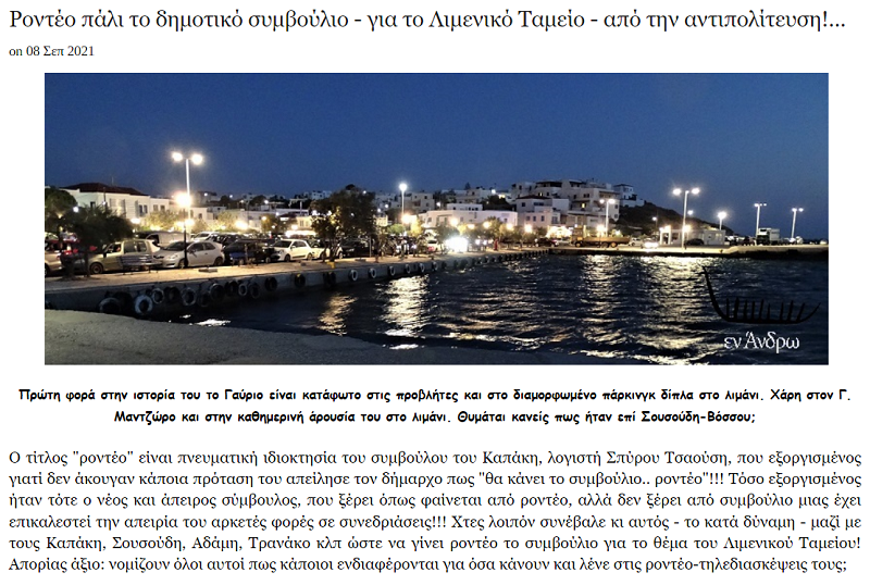 Προσφεύγω σε εσένα "Εν Ανδρω" (κίτρινος τύπος κατά τον γιατρό). Αρχικά η εν λόγω φράση (θα τα κάνω ροντέο)  του φίλου Σπύρου έχει γραφτεί στο "Εν Ανδρω" από παλαιότερο δημοτικό συμβούλιο και περιέχεται   στο δημοσίευμα της 8ης Σεπτεμβρίου 2021. Δύο χρόνια πριν. Άλλωστε και ο ίδιος το παραδέχθηκε στο πλοίο, όπως είπα αρχικά, ότι το είπε στον Δήμαρχο.