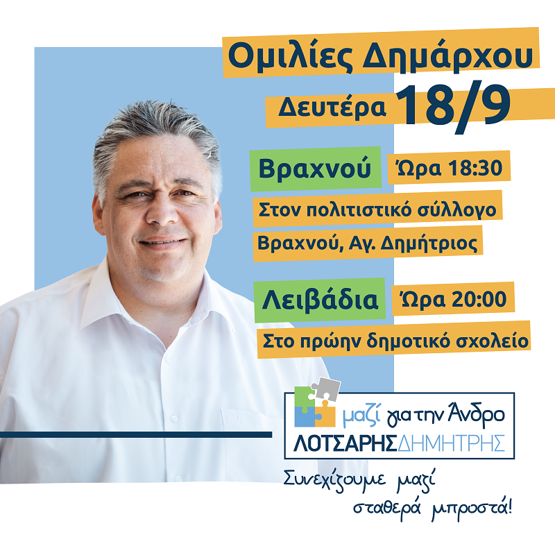 Αναγγελία έναρξης ομιλιών στα χωριά της Άνδρου του Δ. Λοτσάρη. Περιμένουμε με περιέργεια της αναγγελία των περιοδειών του συνδυασμού Σουσούδη για να τον γράψουμε...