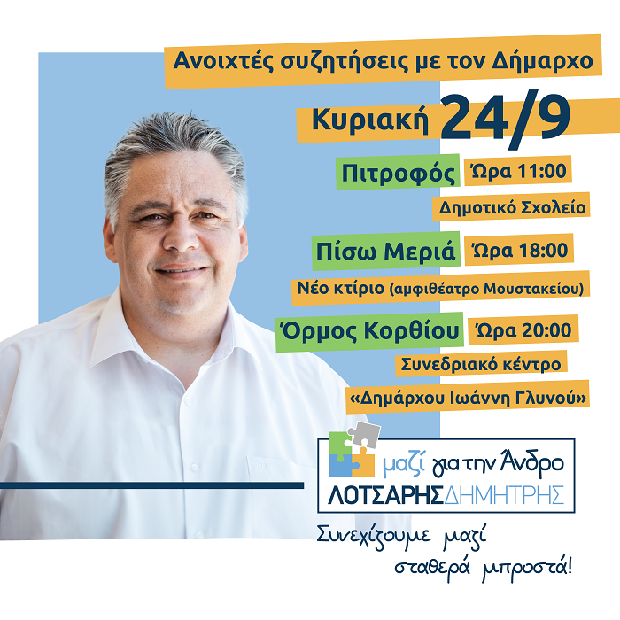 Συνεχίζουμε την παρουσίαση του εξαντλητικού μαραθώνιου των παρουσιάσεων του δημάρχου Δημήτρη Λοτσάρη σε όλα τα χωριά της Άνδρου. Είναι τόσο πολλές που μερικές φορές χάνουμε τον λογαριασμό και ανεβάζουμε τις κάρτες που στέλνει το επιτελείο του με μερικές ώρες καθυστέρηση από την μεριά μας με αποτέλεσμα να μην προλαβαίνουμε κάποιες - όπως πχ την σημερινή που ανεβάσαμε με καθυστέρηση για το Άνω Γαύριο. Ευτυχώς μπήκαν εγκαίρως οι κάρτες με τις ομιλίες στα άλλα πέντε χωριά.