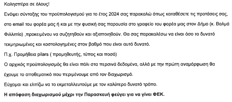 Όμως Βασίλη είναι θέματα που τα περισσότερα έρχονται από το παρελθόν (κάποια πάνω από 20 χρόνια) και όπως εύκολα γίνεται αντιληπτό, δεν υπάρχει δυνατότητα, όλα αυτά να λυθούν μέσα σε έναν χρόνο (προϋπολογισμός 2024) και αν θες και την προσωπική μου άποψη δεν θα λυθούν όλα, ούτε στην επόμενη πενταετία.