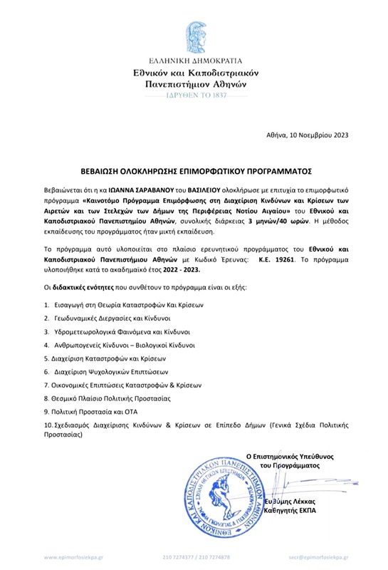 Πιστοποίηση και από το Πανεπιστήμιο Αθηνών το 2023, καθώς συνέχισα την επιμόρφωση μου και στα χρόνια της ευθύνης μου.