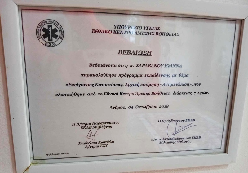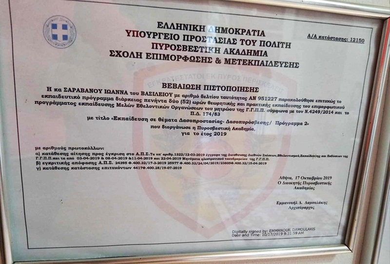 Πιστοποίηση από την Πυροσβεστική Ακαδημία το 2019 και από το ΕΚΑΒ το 2018. Πριν αναλάβω την ευθύνη της Πολιτικής Προστασίας.