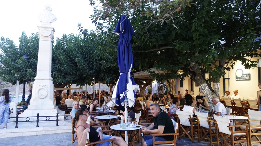 Ανάμεσα στα διάφορα στάσιμα το απογευματινό στην πλατεία Καΐρη. Στο καφέ-μπαρ Notre του φίλου Σίμπουρα. Πάντα φιλόξενος ο Νίκος, πάντα ανοικτός στις νέες ιδέες. Για δεύτερη φορά θα παρουσιάσουμε βιβλίο μας εκεί. Ο λόγος για τις "Ναυτικές Ιστορίες της Άνδρου" που θα παρουσιάσουμε εκεί την Πέμπτη 25 Ιουλίου στις 19:30. Κατόπτευση του χώρου και στη συνέχεια ανηφορίζουμε στον πολυσύχναστο πεζόδρομο της Αγοράς. Και πέφτουμε πάνω σε μια πολύ μεγάλη έκπληξη. Μια υπέροχη υπαίθρια αυτοσχέδια παράσταση του μουσικού συγκροτήματος χάλκινων και κρουστών "Αγία Φανφάρα"!!!