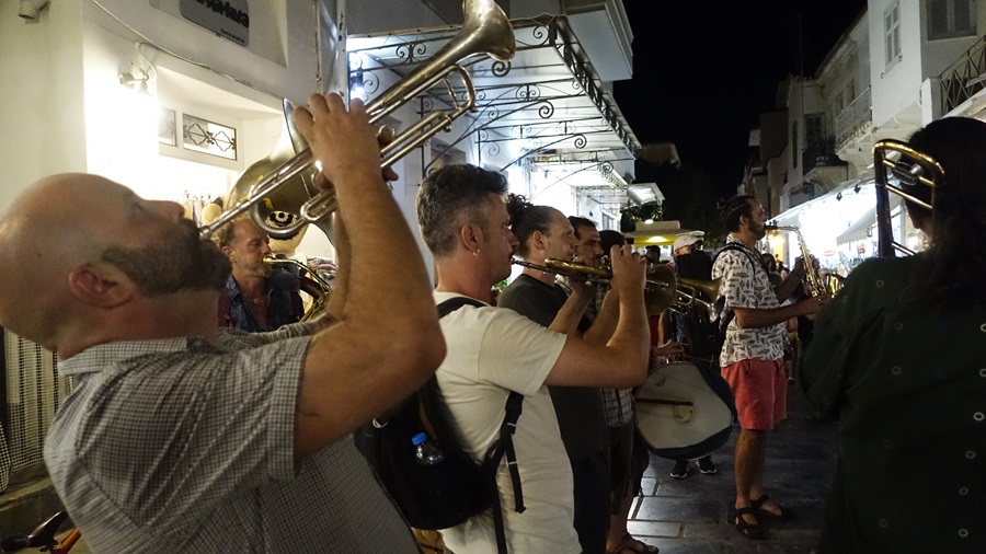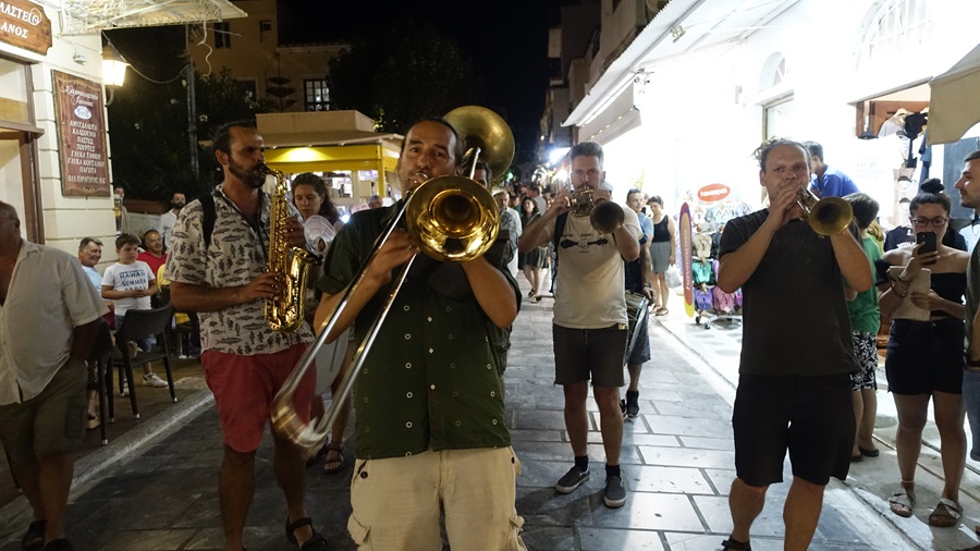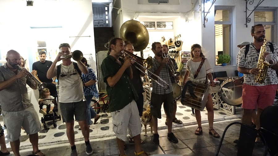 Ανηφορίζαμε ακούσαμε μια μουσική χάλκινων και κρουστών. Μια χαρούμενη μουσική. Σα να θύμιζε Μπρέγκοβιτς. Πλησιάσαμε και ρωτήσαμε. Όντως τα χάλκινα και τα κρουστά που άπλωναν στον πεζόδρομο άλλοτε χαρούμενα κι άλλοτε λυπημένα, άλλοτε νοσταλγικά κι άλλοτε χορευτικά παρέπεμπαν σε πολλές περιοχές της βαλκανικής χερσονήσου. Την μουσική μετέφεραν στην καλοκαιρινή Άνδρο τα 11 από τα 23 μέλη του συγκροτήματος, που προέρχεται από το αθηναϊκό κέντρο κι έφτασε στην Άνδρο να μιλήσει μουσικά στους κατοίκους της. Μια υπέροχη έκπληξη πρωτου μεγέθους για όσους τύχαμε εκείνη την ώρα στον γεμάτο κόσμο πεζόδρομο...