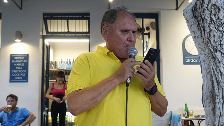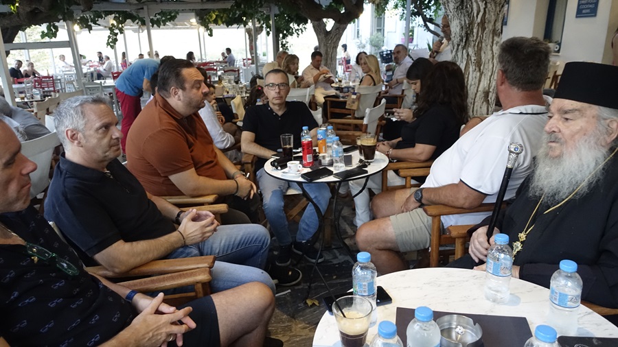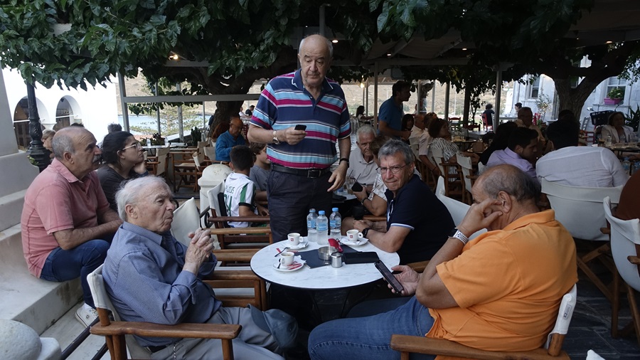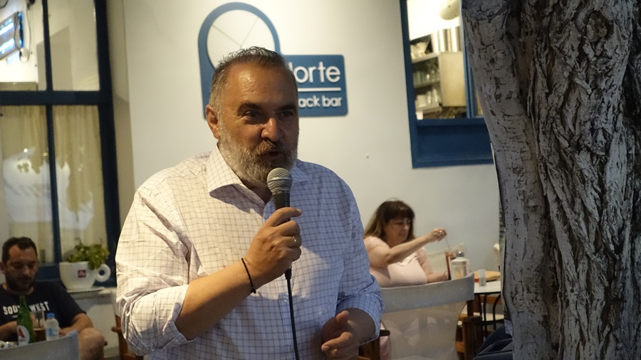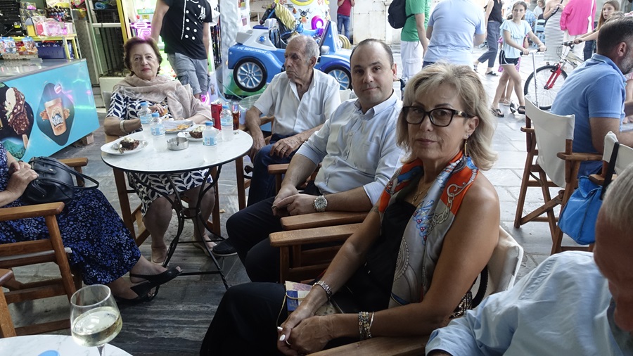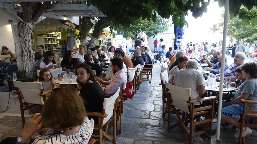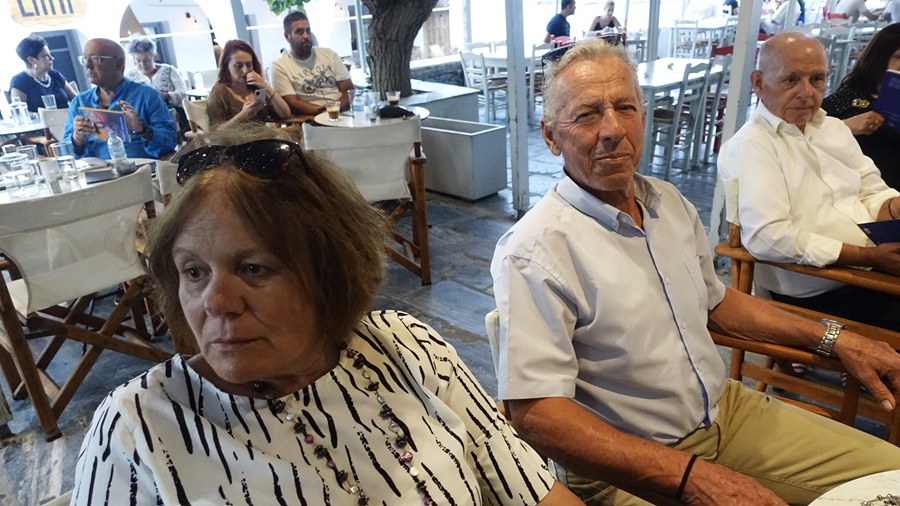 Ο κόσμος άπλωνε από τα όρια του εστιατορίου "Παρέα" μέχρι το περίπτερο. Τουλάχιστον με το μικρόφωνο και το μεγάφωνο μπορούσαμε να ακουγόμαστε. Και ήρθαν πολλοί γνωστοί και φίλοι, αλλά και αρκετοί απρόσμενοι. Θα αναγνωρίσετε πολλούς στις φωτογραφίες που συνοδευουν το κείμενο αυτό. Απλώς να σημειώσουμε τους φίλους της Μονής Παναχράντου, του Ιδρύματος Κυδωνιέως, της Καϊρείου Βιβλιοθήκης, των σωμάτων ασφαλείας, του Χορευτικού Υδρούσας, αλλά και πλήθος αυτοδιοικητικών από όλο το νησί.