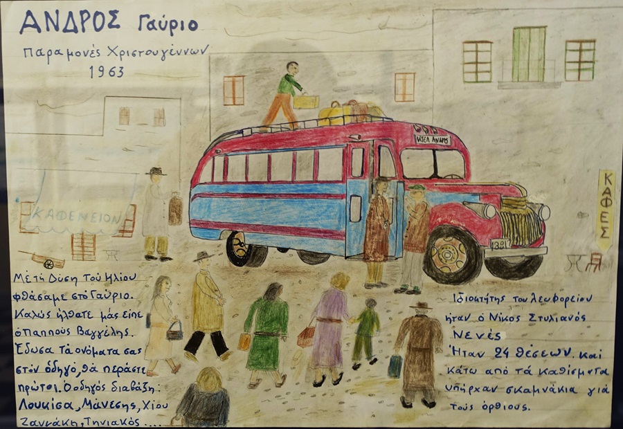 Η αφίσα της έκθεσης προκαλούσε την προσοχή. Μια παιδική ζωγραφιά, ένα λεωφορείο του 1963. Το θυμάμαι αμυδρά. Μικρούλης. 8χρονος ή 9χρονος. Είχα έρθει για καλοκαίρι στην Άνδρο με την μεγάλη μου ξαδέλφη την Κατίνα. Με ένα τέτοιο λεωφορείο πήγαμε καλοκαίρι μέσα της δεκαετίας του 1960 στην Χώρα. Θυμάμαι ακόμα πως κατεβήκαμε, ένα τσούρμο παιδιά διψασμένα για νερό. Στη βρύση πλάι στο δρόμο στον Πιτροφό. Ο οδηγός περίμενε γελώντας. Με ένα τέτοιο ξανάπηγα στη Χώρα 15χρονος. Για καλοκαίρι. Με την μάνα και τον μικρότερο αδελφό μου.