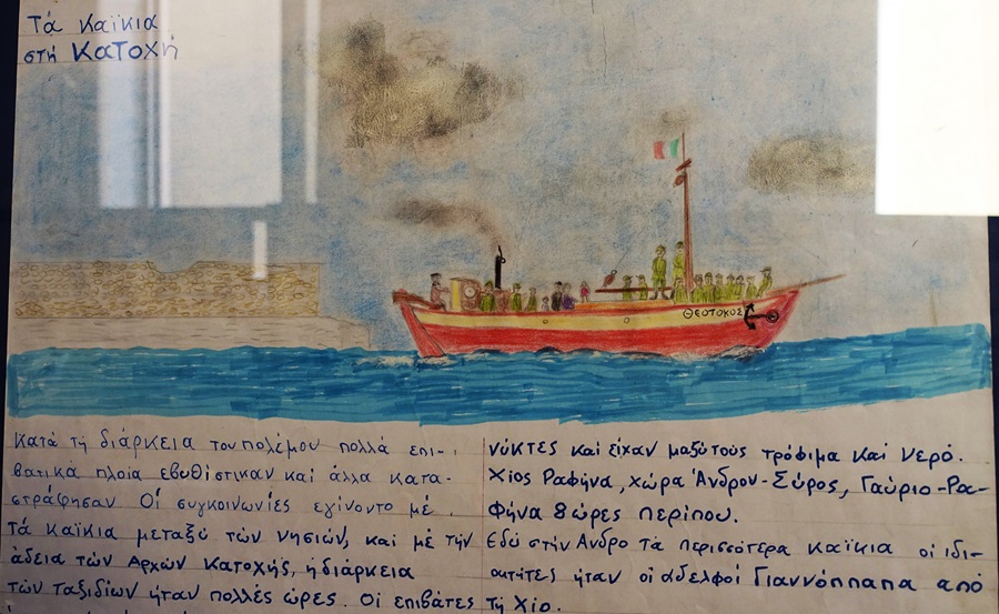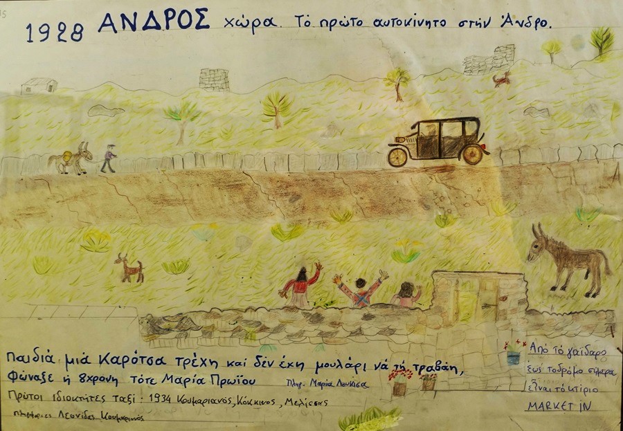 Τότε μάς ξάφνιασε με την ευαισθησία του απέναντι στη μητέρα του. Τώρα μάς ξάφνιασε με τις ζωγραφιές του. Και οι πληροφορίες, οι διάλογοι που συνόδευαν τις ζωγραφιές: το πρώτο αυτοκίνητο στην Άνδρο, το πρώτο ταξί στην Άνδρο. Τα καΐκια στην Κατοχή. Το λεωφορείο του 1963 στην Άνδρο, το Μοσχάνθη του 1960 στην Άνδρο. Το Μοσχάνθη δεν το θυμάμαι...