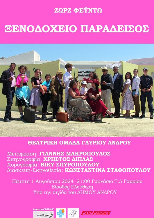 Το θεατρικό έργο Ξενοδοχείο ο Παράδεισος , του συγγραφέα Ζώρζ Φεϋντώ , ανέβασε με επιτυχία η θεατρική ομάδα Γαυρίου Άνδρου στο προαύλιο του Γυμνασίου - Λυκείου Γαυρίου . Η υπόθεση του έργου βασίζεται στην συζυγική απιστία και μέσα από κωμικές παρεξηγήσεις και ατυχείς συμπτώσεις ξετυλίγεται το έργο προκαλώντας ασυγκράτητο γέλιο.