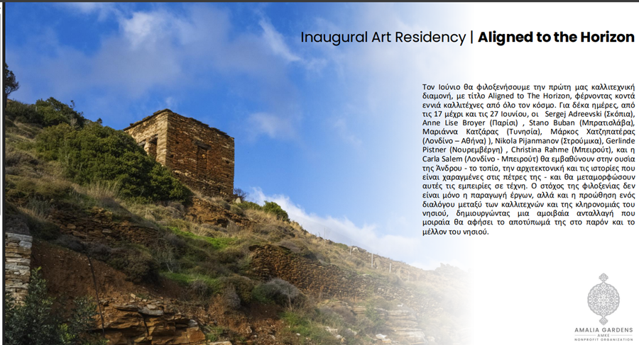 θα εμβαθύνουν στην ουσία της Άνδρου - το τοπίο, την αρχιτεκτονικήκαι τις ιστορίες που είναι χαραγμένες στις πέτρες της - και θα μεταμορφώσουν αυτές τις εμπειρίες σε τέχνη. Ο στόχος της φιλοξενίας δεν είναι μόνο η παραγωγή έργων, αλλά και η προώθηση ενός διαλόγου μεταξύτων καλλιτεχνών και της κληρονομιάς του νησιού, δημιουργώντας μια αμοιβαία ανταλλαγή που μοιραία θα αφήσει το αποτύπωμά της στο παρόν και το μέλλον του νησιού.