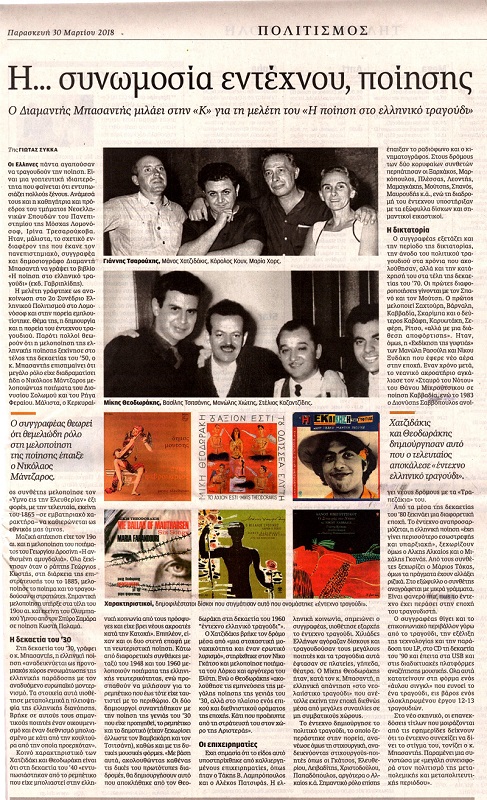 Η ΠΟΙΗΣΗ ΤΗΣ ΓΕΝΙΑΣ ΤΟΥ '30: Το σημείο συνάντησης της μουσικής γενιάς του ’50 με την ποιητική γενιά του ’30 ήταν η κρίση, ο πόλεμος, η εθνική καταστροφή και η ανάγκη επαναπροσδιορισμού της ελληνικής κοινωνίας στον κόσμο. Η γενιά του ’30 καθορίστηκε πολιτικά, κοινωνικά και πολιτισμικά από τον εθνικό διχασμό του 1916 και την εθνική καταστροφή του 1922. Και βίωσε έντονα την ανάγκη της εθνικής ανασύνταξης και του πολιτισμικού επανακαθορισμού. Επίσης, ήταν η πρώτη γενιά με μοντέρνα ευρωπαϊκή παιδεία, η οποία επιχείρησε να εντάξει τις καλλιτεχνικές αναζητήσεις της μέσα στις νέες αναζητήσεις της Ευρώπης του Μεσοπολέμου.