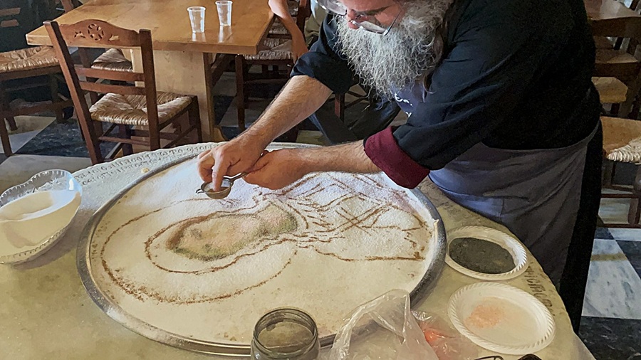 Κι όμως δεν είναι ψηφιδωτό κανονικό. Είναι ψηφιδωτό με κόλλυβα. Ή, μάλλον με υλικά από τα οποία φτιάχνονται τα κόλλυβα. Είναι ένα μικρό έργο τέχνης. Μοναδικό και εφήμερο. Είναι μια μοναδική χειροποίητη κατασκευή από έναν καλλιτέχνη μοναχό...