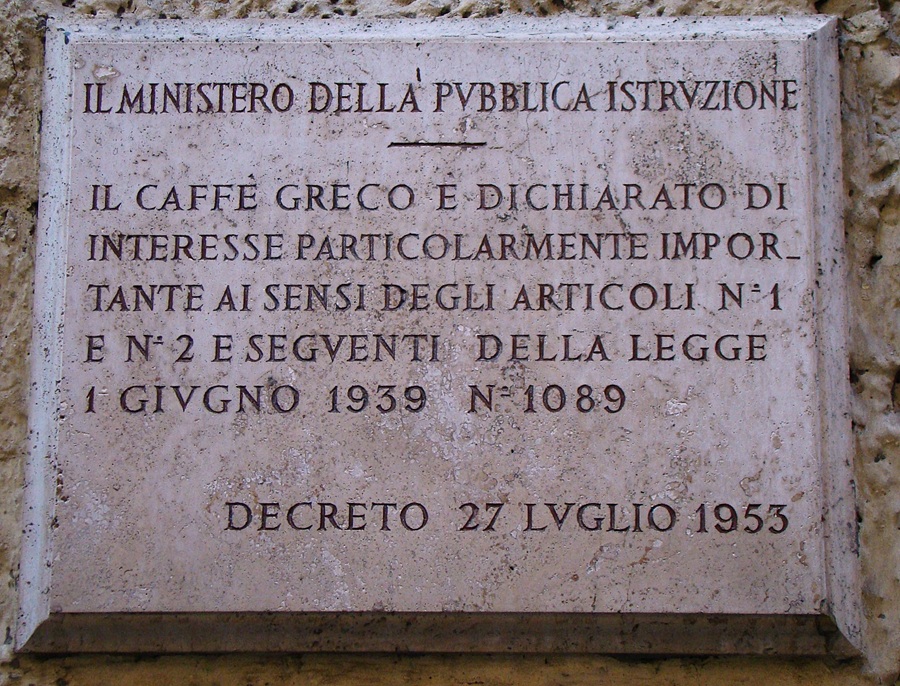 Η αναθηματική πλάκα γράφει: «Το Υπουργείο Δημόσιας Εκπαίδευσης κηρύσσει το Καφέ Γκρέκο ως ιδιαίτερης σημασίας ενδιαφέροντος, σύμφωνα με τα άρθρα υπ’ αριθ. 1 και 2 και τα επόμενα του νόμου της 1ης Ιουνίου 1939. Διάταγμα της 27ης Ιουλίου 1953.»