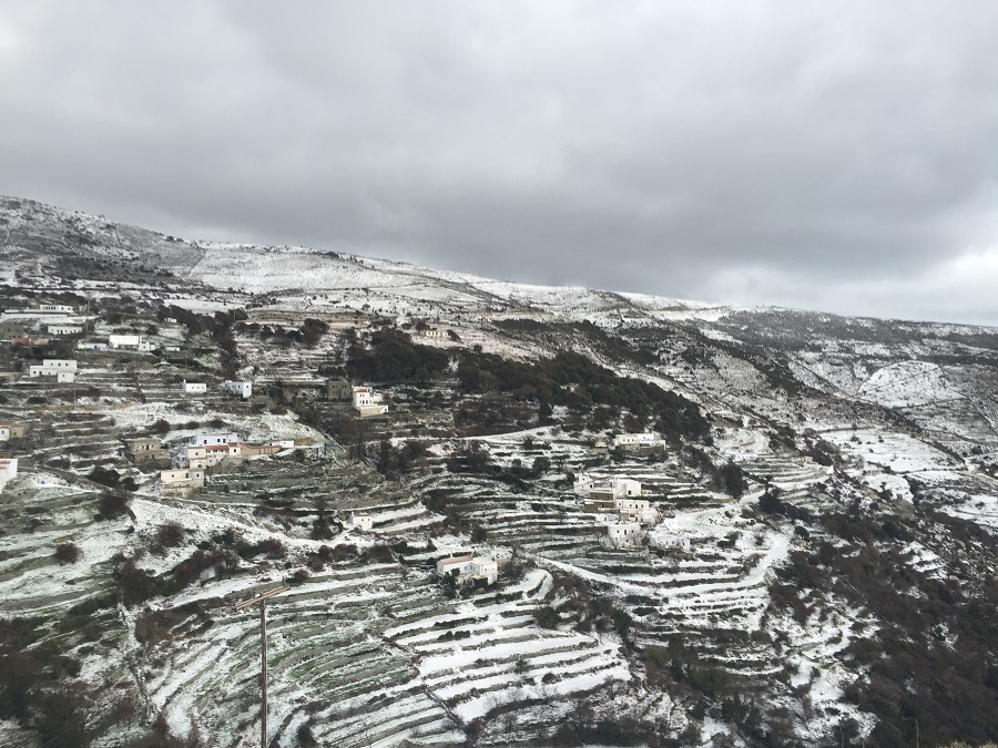 Η Βουρκωτή, χιονισμένη και απομωνομένη. Εδώ μόνο μια ανάμνηση η καλοκαιρινή γαλάζια Άνδρος. Είμαστε στην χειμωνιάτικη Άνδρο: του λευκού και του γκρίζου.