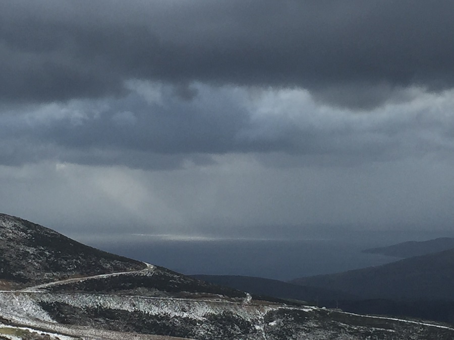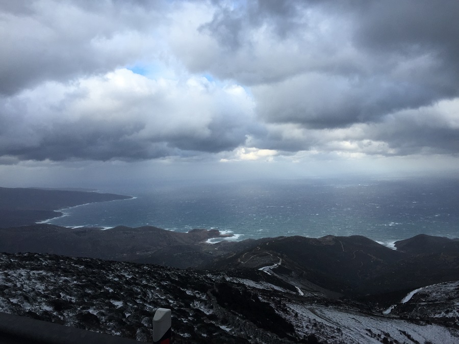 Ο δρόμος πλησιάζει στο Μπατσί. Στο βάθος τα Γαυρονήσια. Το χιόνι έχει μείνει πίσω. Οι πρώτες αχτίνες ενός παγωμένου ήλιου δίνουν ελπίδες για το τέλος της καταιγίδας.