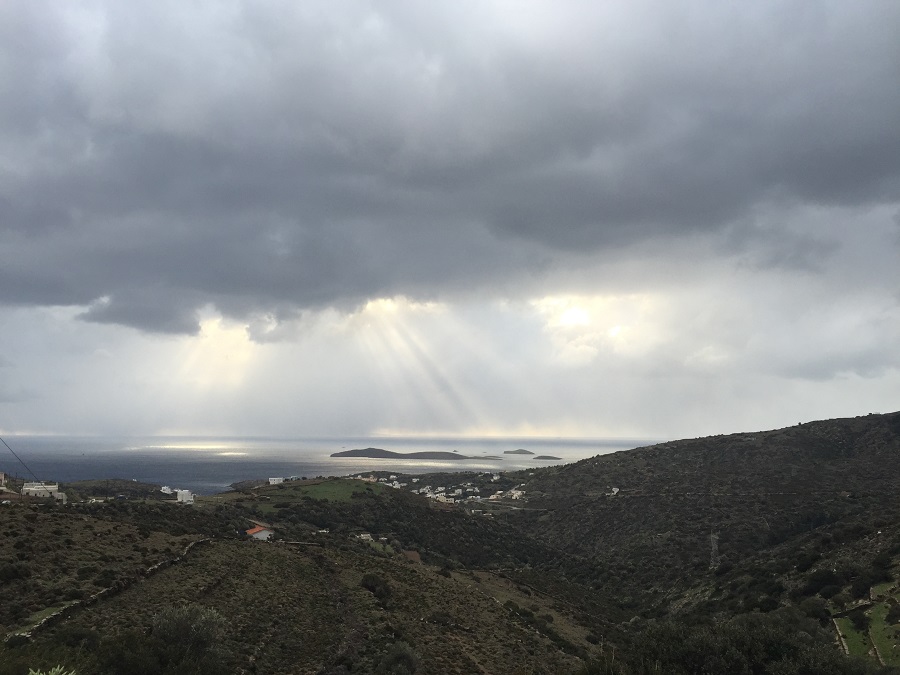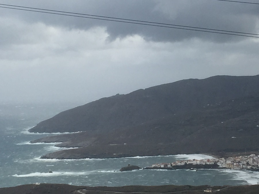 Σαν καράβι η Άνδρος μπροστά στο ανταριασμένο Αιγαίο. Μεγάλα μαύρα βουνά που καταλήγουν στο αφρισμένο πέλαγος. Κατω η Χώρα σαν ένα μικρό καράβι ακουμπισμένο πάνω στο μεγάλο καράβι. Άνδρος και Χώρα ταξιδεύουν αιώνες τώρα στο ίδιο πέλαγος.