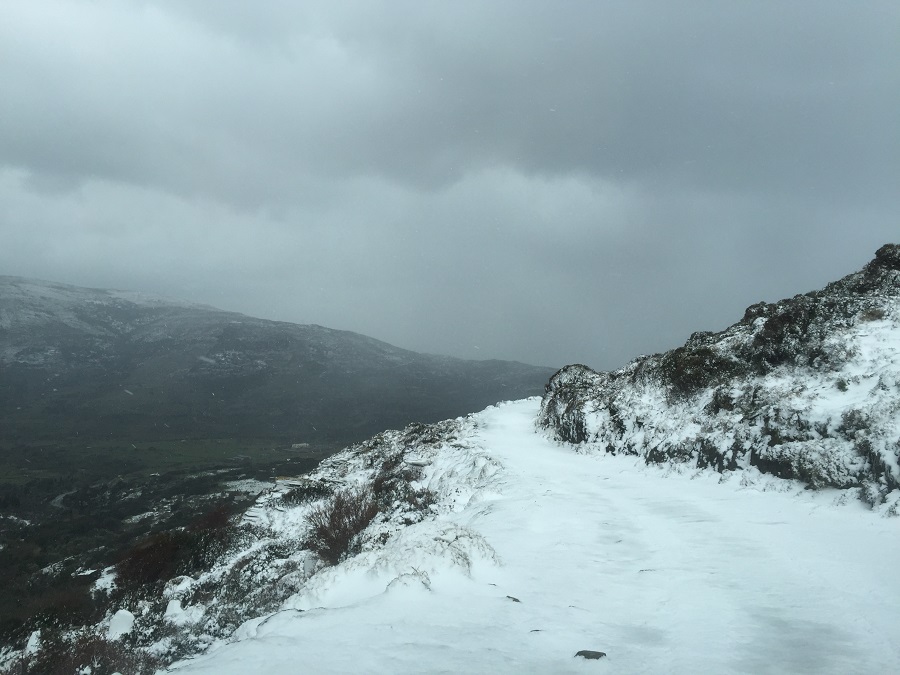 Κατηφορίζοντας προς το Μπατσί. Βαρύς ο ουρανός, αλλά το χιόνι αραιό.