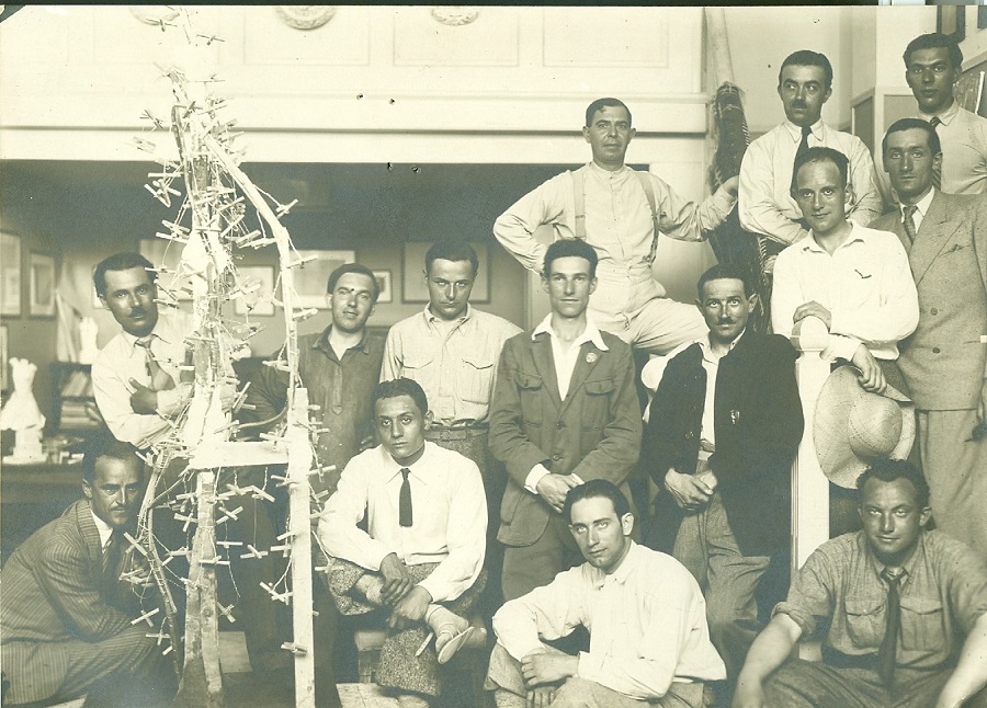 Ο Μιχάλης Τόμπρος (όρθιος τρίτη σειρά τρίτος από δεξιά) σε προετοιμασία έκθεσης του κατά τον μεσοπόλεμο. Στην άκρη ο Ανδρέας Εμπερίκος (όρθιος τρίτη σειρά πρώτος από δεξιά) - από το αρχείο του Λεωνίδα Εμπειρίκου