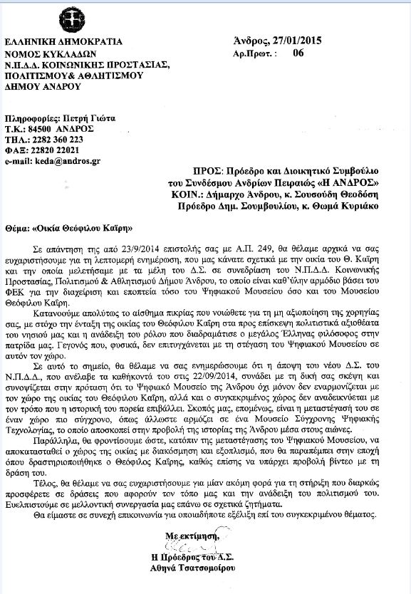 Αναλυτικά, η πρόεδρος του νομικού προσώπου πολιτισμού και αθλητισμού κ. Αθηνά Τσατσομοίρου απάντησε με επιστολή της θετικά στην κ. Λινού (27/1/2015), για το ζήτημα της μετατροπής και πάλι σε μουσείο Θεόφιλου Καΐρη του χώρου όπου ήταν η οικία του μεγάλου ανδριώτη φιλοσόφου και δάσκαλου. Ο χώρος είχε δυστυχώς μετατραπεί από την προηγούμενη διοίκηση και τους συνεργάτες της σε μουσείο …τεχνολογίας! Το ατόπημα αυτό το είχε επισημάνει από το «εν Άνδρω» η κ. Βασιλική Λινού το περαμένο καλοκαίρι, καθώς ο Σύνδεσμος Ανδρίων Πειραιώς είχε χρηματοδοτήσει το μουσείο Καΐρη και το οποίο «έσβησε» ξαφνικά αντικαθιστάμενο με μια άλλη χρήση.