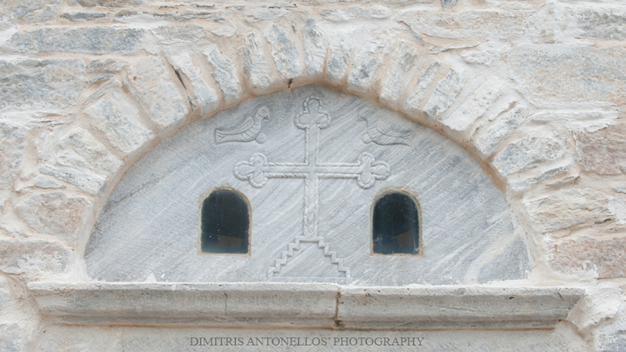Και ο εσωτερικός χώρος του ναού παρουσιάζει ενδιαφέρον, με μικρούς κίονες, μαρμάρινο τέμπλο και πλάκες στρωμένες στο δάπεδο. Μια μαρμάρινη ανάγλυφη πλάκα- πιθανόν από παλιότερο τέμπλο άλλου ναού- βρίσκεται μπροστά από την ωραία πύλη. Η είσοδος του Ναού έχει στο πάνω μέρος μαρμάρινο φεγγίτη ιδιαίτερα διακοσμημένο.