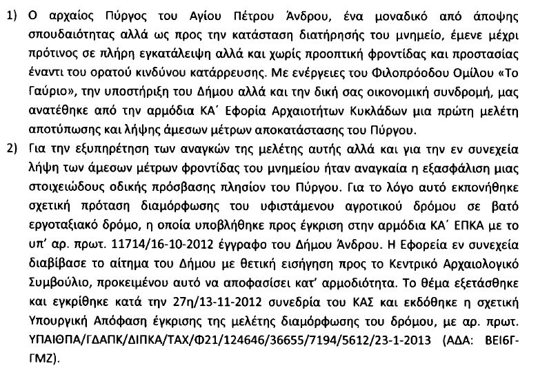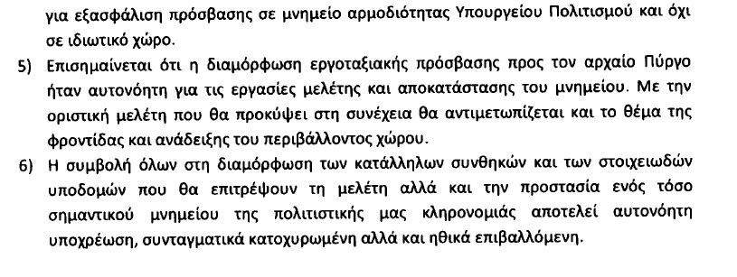 "....Αντί να επικοινωνήσετε μαζί μου για να συνεργαστούμε, με καλείτε να απολογηθώ – και μάλιστα εντός 5 ημερών! Τι ντροπή πραγματικά! Όπως θα δείτε και στην απάντηση του κορυφαίου αρχαιολόγου κου Λαμπρινουδάκη, αγωνίζομαι εδώ και 58 χρόνια για την αναστήλωση του Πύργου.
