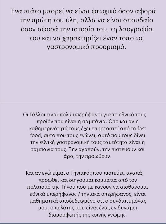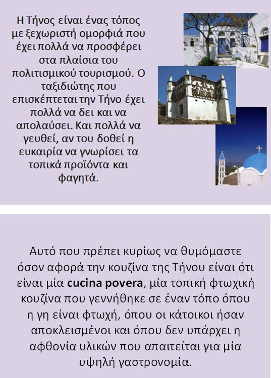 (Πριν μια εβδομάδα στην Τήνο διοργανώθηκε μεγάλο γαστρονομικό συνέδριο με θέμα "Μπορεί η Τήνος να γίνει γαστρονομικός προορισμός;" Όλες οι επιχειρήσεις του νησιού και όλα τα χωριά συνεργάστηκαν και έφεραν στο νησί τους 6 από τους καλύτερους μαγείρους των Κυκλάδων (Άνδρο, Σαντορίνη κλπ). Από την Άνδρο προσκλήθηκε η Κατερίνα Ρεμούνδου (Τάτα) και έκανε μια μεγάλη εισηήγηση τόσο σε γενικό επίπεδο όσο και μια ανάλυση της "φτωχής κουζίνας" που έχουν οι Κυκλάδες. Είχαν προσκληθεί οι καλύτεροι έλληνες δημοσιογράφοι σχετικοί με γαστρονομία και ταξίδια. Από την εισήγηση της Κ. Ρεμούνδου παραθέτουμε εδώ το οτπικό υλικό. Αύριο θα παραθέσουμε και το κείμενο της πολύ ενδιαφέρουσας εισήγησης της μήπως και σκεφτούμε κι εμείς κάτι τέτοιο στην Άνδρο - εν Άνδρω).