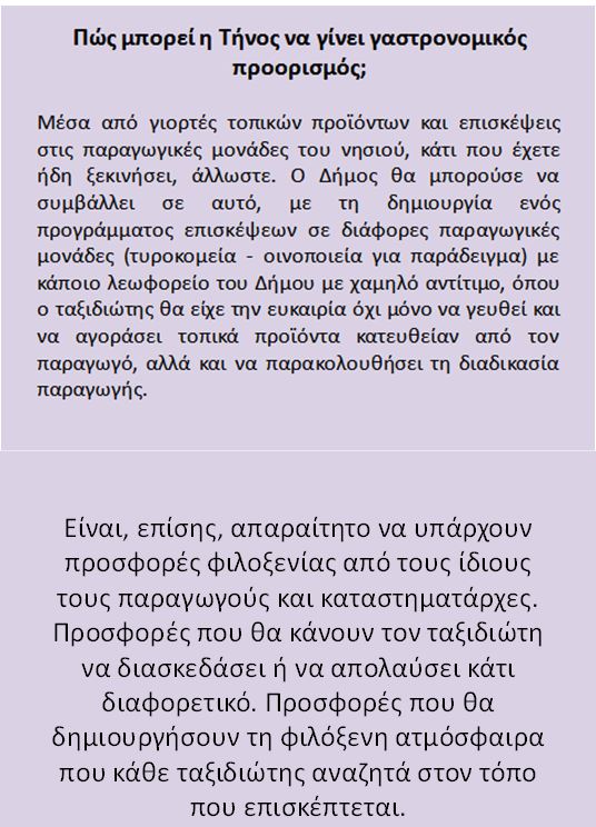 Σημείωση: Το κόστος του τριήμερης διάρκειας γαστρονομικού συνεδρίου ήταν ...μηδέν!!! Κι αυτό γιατί η διαμονή, τα φαγητά, οι μετακινήσεις, οι επισκέψεις, ο συνεδριακός χώρος κλπ ήταν προσφορά όλων των επαγγελματιών του νησιού. Το οργάνωσαν όλοι μαζί. Και καθένας πρόσφερε ότι είχε (δωμάτια, γεύματα, κλπ). Το όλο γεγονός είχε προετοιμαστεί άρτια και επαγγελματικά. Και βεβαιώς όπως εξηγούσαν ο Γ.Τ. και ο Δ.Α. από το Κόρθι, που είχαν δει και τις σχετικές αναρτήσεις στα site του γειτονικού νησιού, οι Τηνιακοί δεν είναι τοπικιστές όπως οι Ανδριώτες που οι τρεις πρώην Δήμοι μας τείνουν να έχουν και σύνορα. Η επιτυχία του συνεδρίου είναι πως το εξαιρετικό υλικό του αναπαράχθηκε σε όλα τα site των Κυκλάδων. Και λόγω της υψηλής ποιότητας των εισηγήσεων, των φαγητών και των επισκέψεων σε χώρους πρωτογενούς παραγωγής αναμένουν τώρα πολλά αφιερώματα για την Τήνο στην Αθήνα.